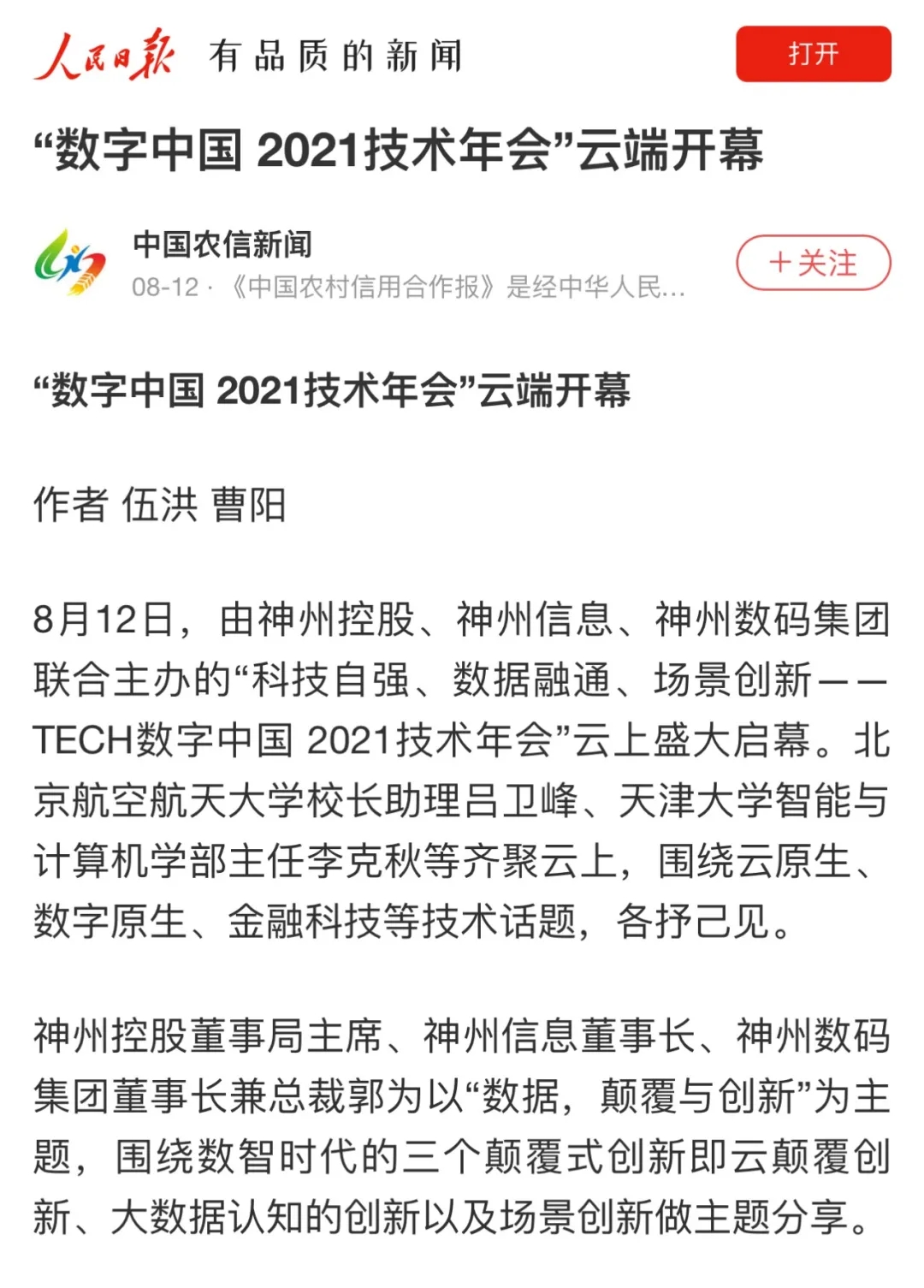 8月12日,由神州控股、神州信息、bbin宝盈集团联合主办的“科技自强、数据融通、场景创新——TECH数字中国 2021技术年会”云上盛大启幕,发布神州信创云、ModelB@nk5.0、金融超脑Sm@rtFSB、云原生数字化安全底座、园区智能体等重磅产品,国内各大权威、影响力媒体多角度多频次对盛况进行报道!